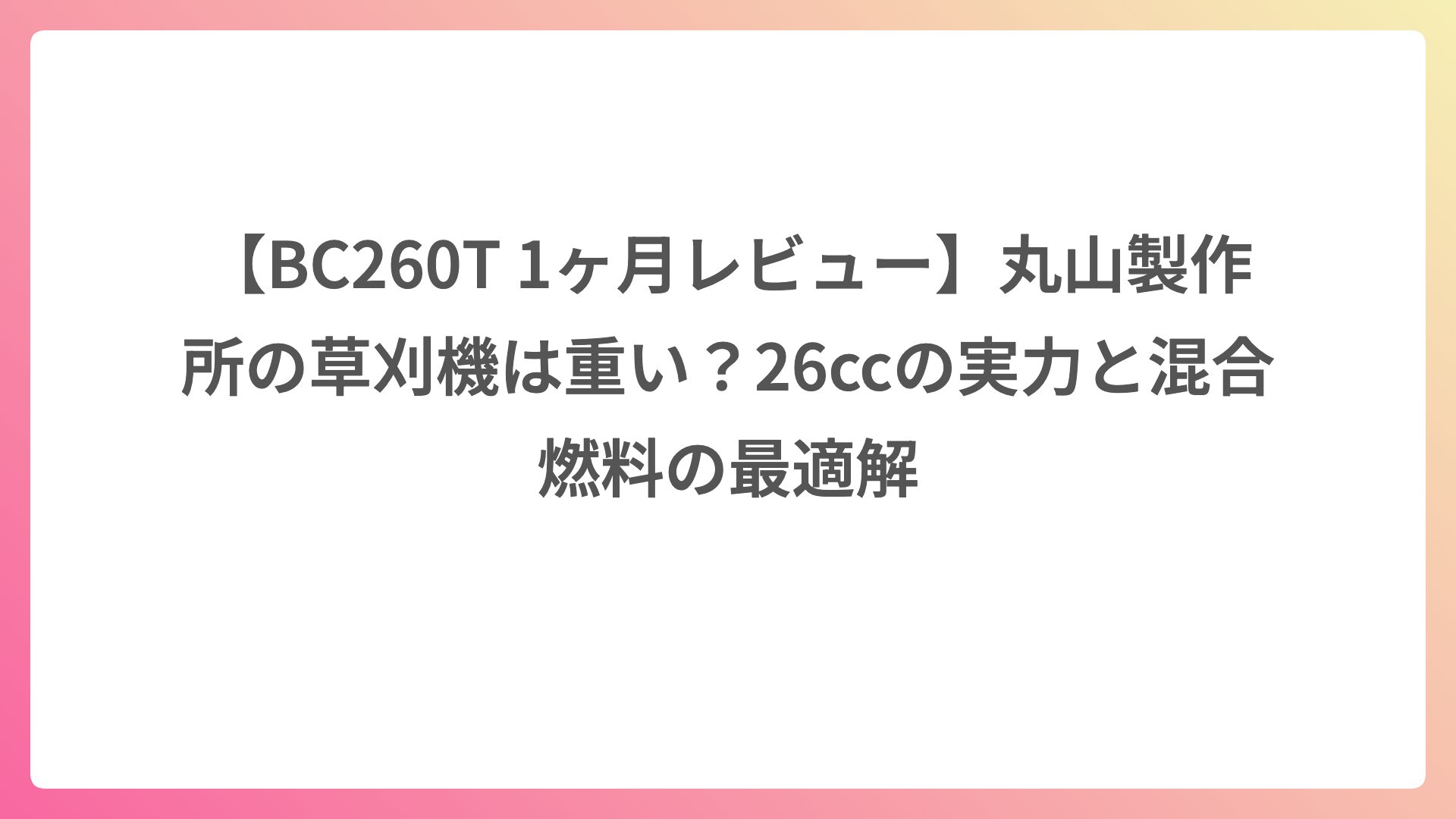 ARCHIVES 2024年8月 【BC260T 1ヶ月レビュー】丸山製作所の草刈機は重い?26ccの実力と混合燃料の最適解 2024.08.31 刈払機・工具レビュー kenta1118 kenta1118の実体験レビュー録
