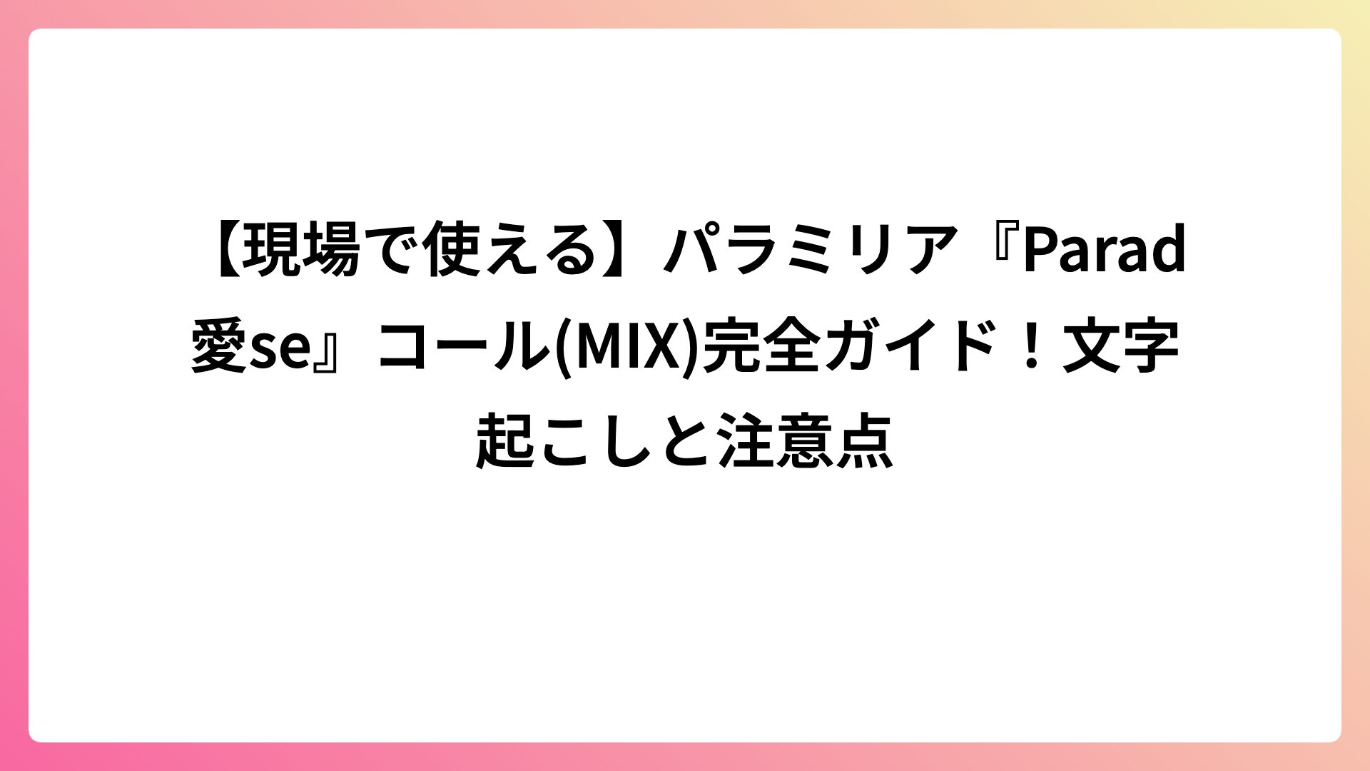 CATEGORY HOBBY 【現場で使える】パラミリア『Parad愛se』コール(MIX)完全ガイド!文字起こしと注意点 2025.08.04 HOBBY kenta1118 kenta1118のブログ 道頓堀のグリ下でライブしているアイドルは、シンセカイヒーローというアイドルグループです! 2025.07.27 HOBBY kenta1118 kenta1118のブログ 【推しが見つかる】ParaMilia(パラミリア)はこんなグループ!魅力と全メンバーの個性を徹底解説 2025.07.27 HOBBY kenta1118 kenta1118のブログ Chance Movement(シャンス ムーブメント)は、滋賀を拠点とする幸せを呼ぶアイドルグループです。 2024.07.18 HOBBY kenta1118 kenta1118のブログ NMB48初の個別握手会に当選!握手会までの申し込み方法。 2024.04.27 HOBBY kenta1118 kenta1118のブログ 【即解決!】キンブレの色が変わらない原因とメモリー機能のリセット方法(キングブレード) 2024.02.14 HOBBY kenta1118 kenta1118のブログ NMB48衣装展に行ってきた。歴代の衣装が並べてあり、カモネギックスで紅白に出た衣装も並べてあり感動! 2024.01.26 HOBBY kenta1118 kenta1118のブログ 推し活の経済効果は絶大!オタクたちの遠征費は地域を潤す。 2023.12.26 HOBBY kenta1118 kenta1118のブログ ICOCAを使用して米子支社管内の山陰線を走るワンマン列車を乗ってみた。 2023.09.13 HOBBY kenta1118 kenta1118のブログ NMB48劇場公演に行く前に、これだけは押さえておきたいMIXと、メンカラ。 2023.08.18 HOBBY kenta1118 kenta1118のブログ もっと見る