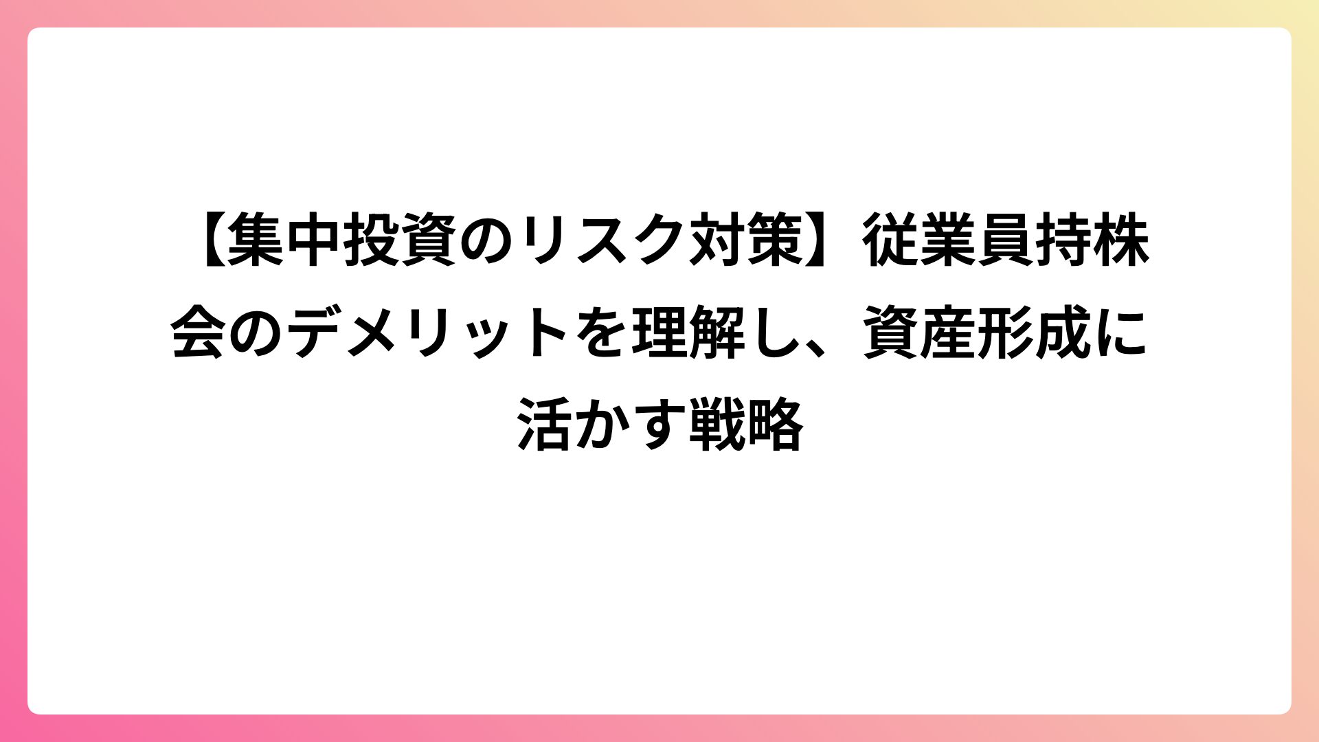 TAG 従業員持株会 【2025年最新】マネーフォワード MEで従業員持株会を連携!自動更新で資産を正確に把握 2024.05.06 マネーフォワードで資産管理 kenta1118 kenta1118のブログ 【サラリーマン向け】従業員持株会で確定申告が必要な理由とマネーフォワードクラウドでの手順 2024.02.11 マネーフォワードで資産管理 kenta1118 kenta1118のブログ 【持株会】単元株になったらどうする?「継続 vs 現金化」複利効果を最大化する判断基準 2023.07.17 マネーフォワードで資産管理 kenta1118 kenta1118のブログ 【マネーフォワードで配当金管理】従業員持株会の再投資分を設定・入力する方法 2023.01.14 マネーフォワードで資産管理 kenta1118 kenta1118のブログ 【API未対応者向け】マネーフォワード MEに従業員持株会を手動で設定する方法と注意点 2022.04.16 マネーフォワードで資産管理 kenta1118 kenta1118のブログ 【最強の福利厚生】従業員持株会は配当金再投資で資産が爆増する!15年続けた効果を解説 2022.03.10 マネーフォワードで資産管理 kenta1118 kenta1118のブログ 【投資デビューは持株会が最適】投資初心者に比較的安全な理由と資産形成の基本戦略 2021.04.28 マネーフォワードで資産管理 kenta1118 kenta1118のブログ 【集中投資のリスク対策】従業員持株会のデメリットを理解し、資産形成に活かす戦略 2021.04.21 マネーフォワードで資産管理 kenta1118 kenta1118のブログ